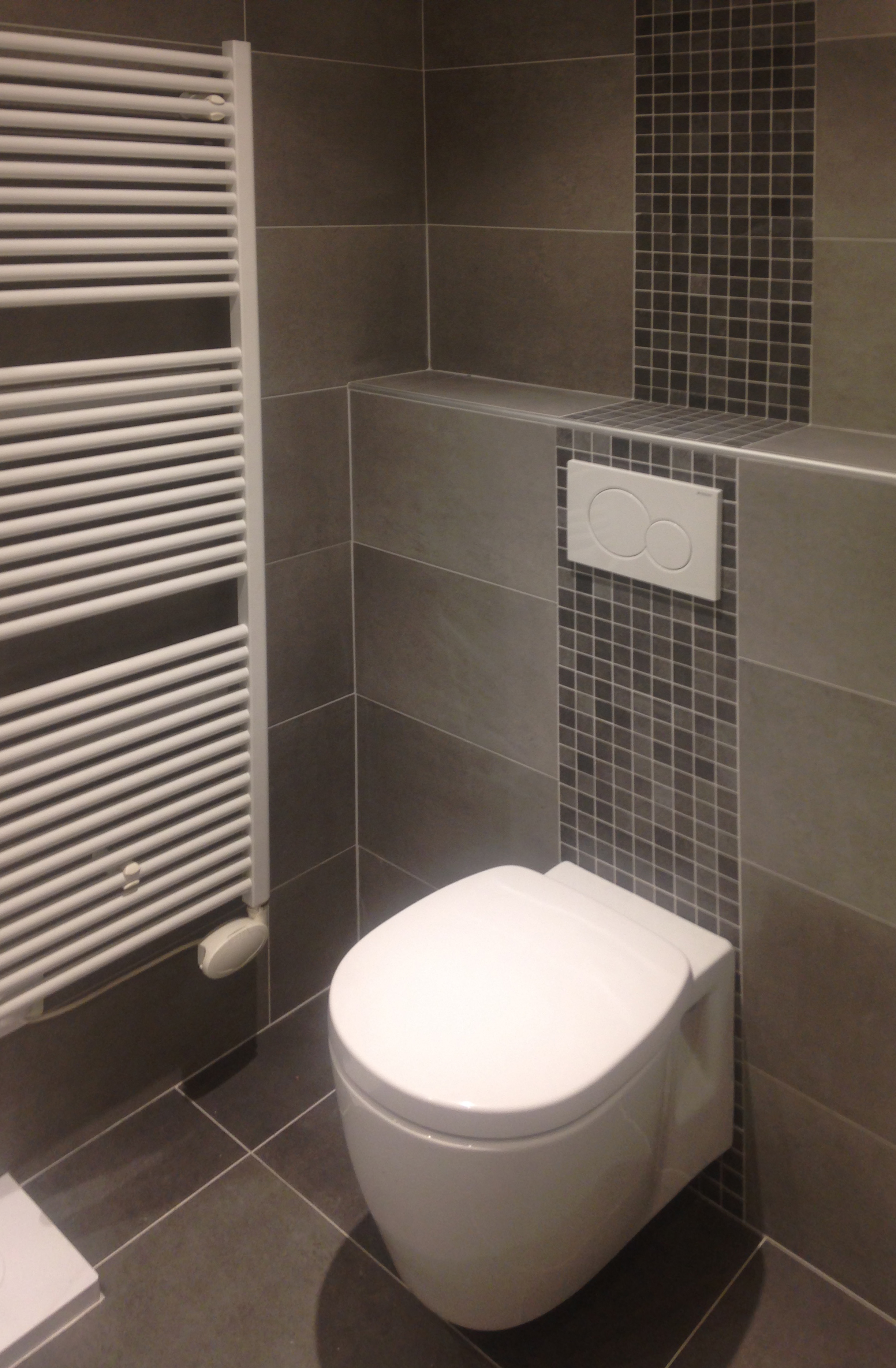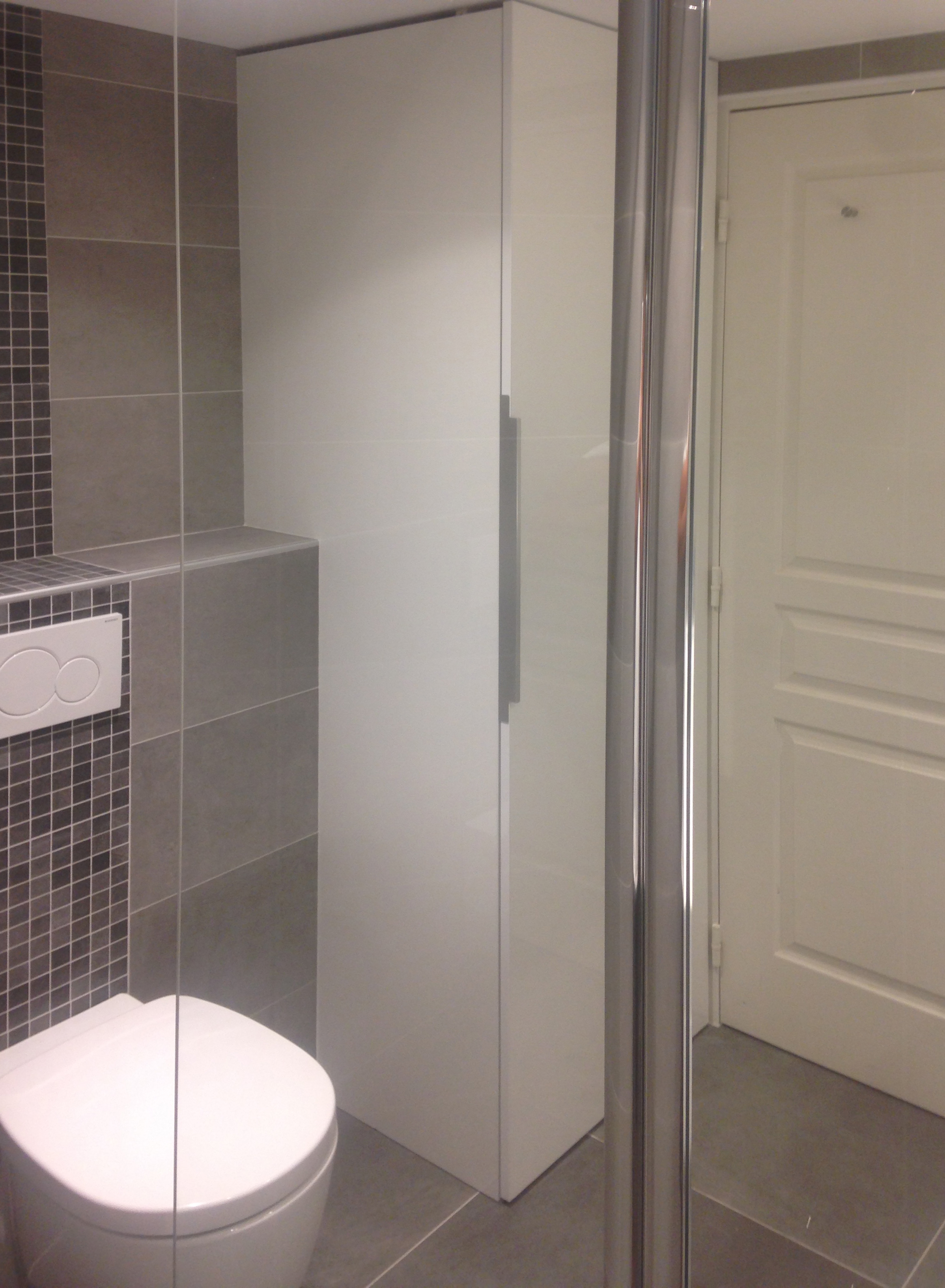 Ici petite salle de bain refaite à neuf avec douche à l’italienne et carrelage gris.
